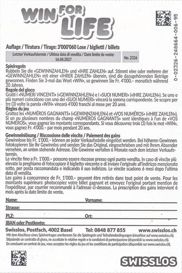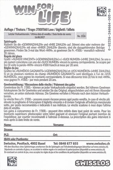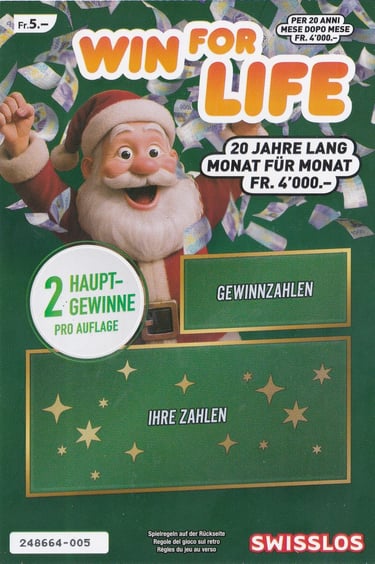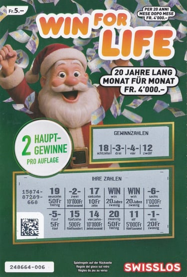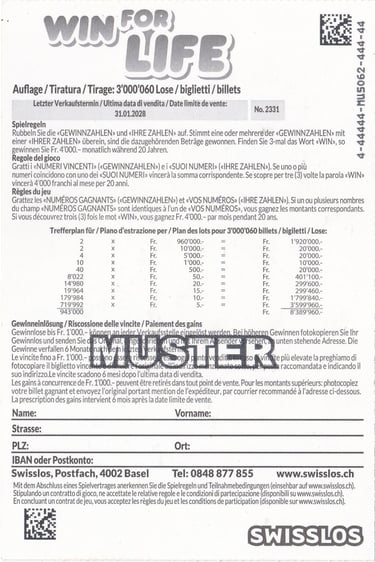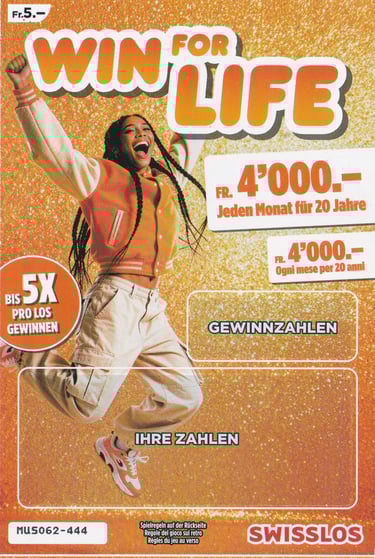 Desde 01.01.2019, os prémios de lotaria até 1 milhão de francos suíços estão isentos de imposto antecipado e de imposto sobre o rendimento. Regras do jogo no verso.