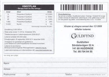 Morada para envio de bilhetes premiados: Guldlotten, Sördalavägen 22 A, Huddinge