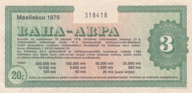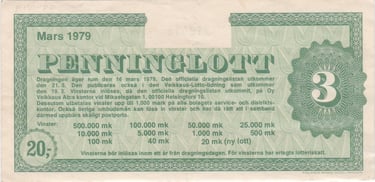 Série: RAHA-ARPA / PENNINGLOTT Valor facial: 20 markka finlandeses Data do sorteio: 16 de março de 1979 Publicação oficial dos resultados: 21 de março de 1979