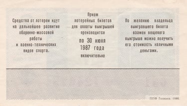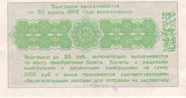 Data de validade para resgate de prémios: Até 30 de abril de 1988 (Prémios até 25 rublos pagos no ponto de venda; prémios superiores a 1000 rublos sujeitos a verificação em caixas de poupança oficiais)