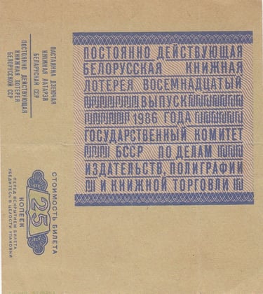 Frente: padrão ornamental azul e bege, com inscrição vertical “Постоянно действующая Белорусская книжная лотерея”