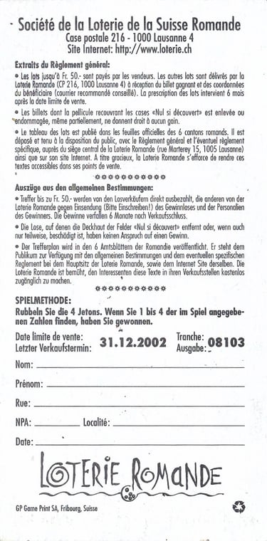 Fondée en 1986 à Fribourg, GP Game Print SA s’est consacrée à l’impression de billets de loterie et de jeux, intégrant des systèmes mathématiques appliqués. Dissoute en 2018, elle reste un témoin de la précision suisse et de l’évolution internationale des imprimeurs de loterie.