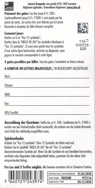 REMARQUE : Le code QR indique le numéro de jeu 864, et plus bas dans la tranche : 02851