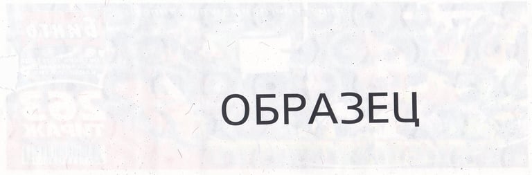 A imagem mostra a palavra ОБРАЗЕЦ, que em russo significa "amostra" ou "exemplar". É comum encontrar essa marcação em bilhetes de loteria, documentos oficiais ou produtos gráficos usados para demonstração, teste ou aprovação antes da produção final.